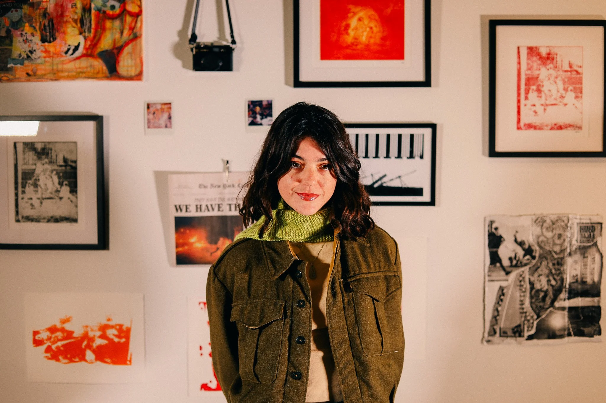 Her practice examines how image, power, and public life intersect in contemporary America. Moving between documentary footage and materially intensive studio processes, she traces the residue of political spectacle, militarism, labor, and collective resistance. Working in the field—at protests, parades, campuses, and institutional spaces—she gathers fragments that later reappear transformed through etching, collage, and installation.